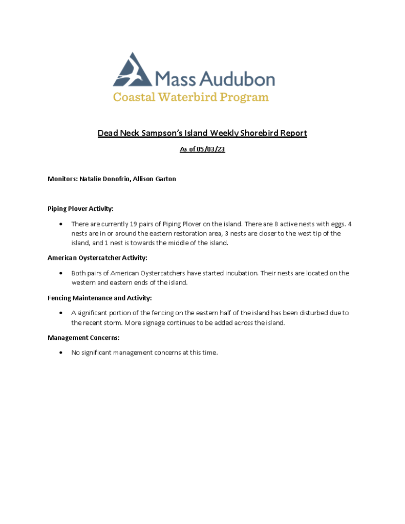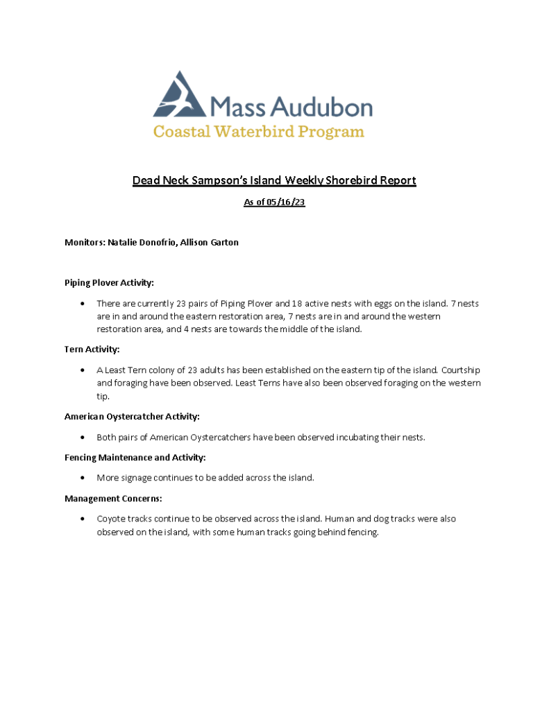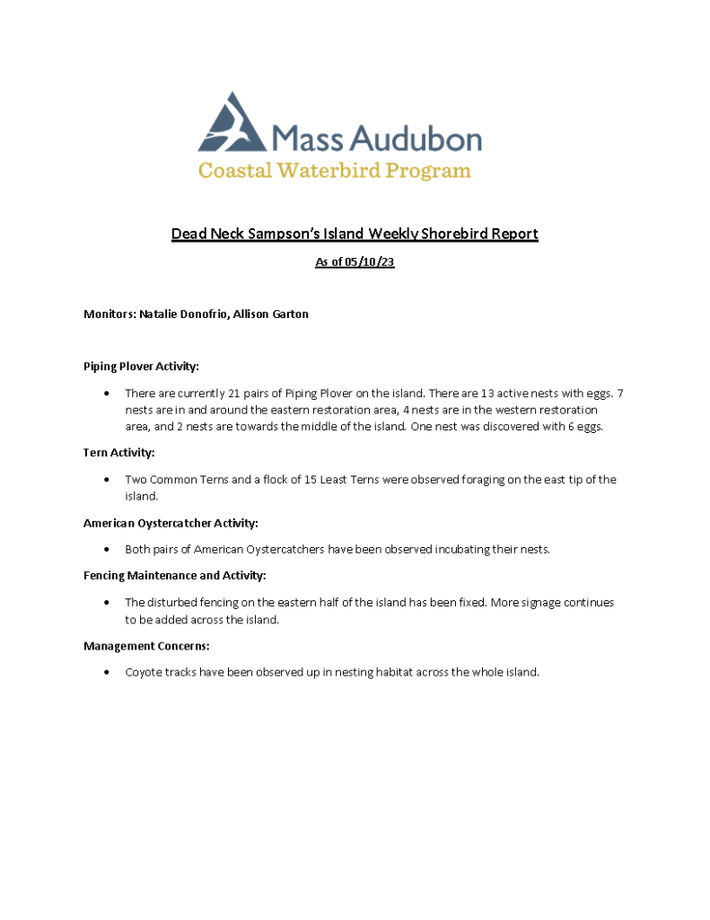 There have been 19 pairs of Piping Plovers on the island this season. There are no active unfledged broods on the island anymore. There are no more active nests on the island.