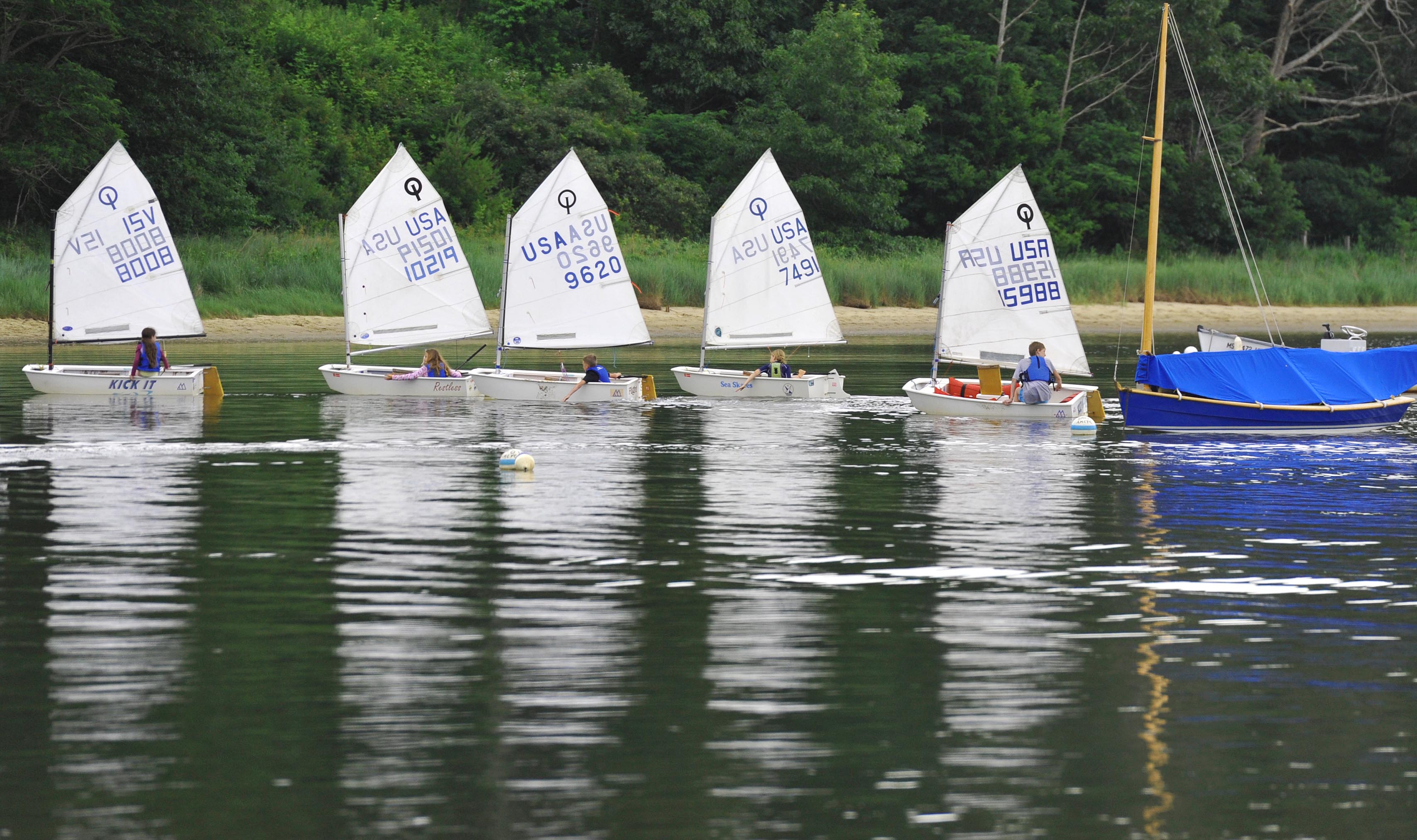 COTUIT 07/2/19 The mosquito fleet heads back to home port at Ropes Beach in calm seas after a morning sailing lesson on Cotuit Bay. Steve Heaslip/Cape Cod Times