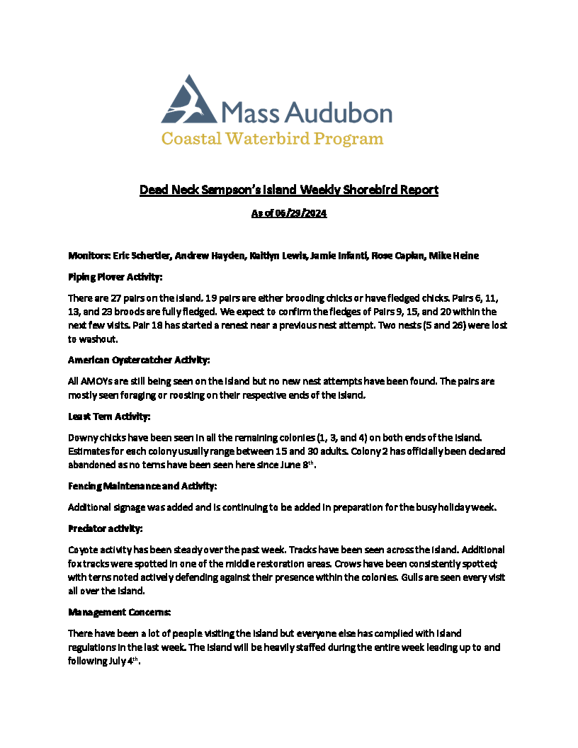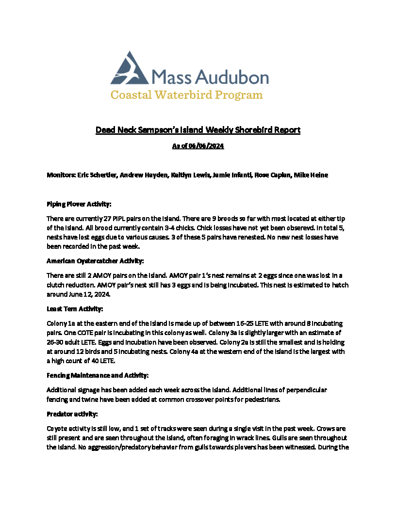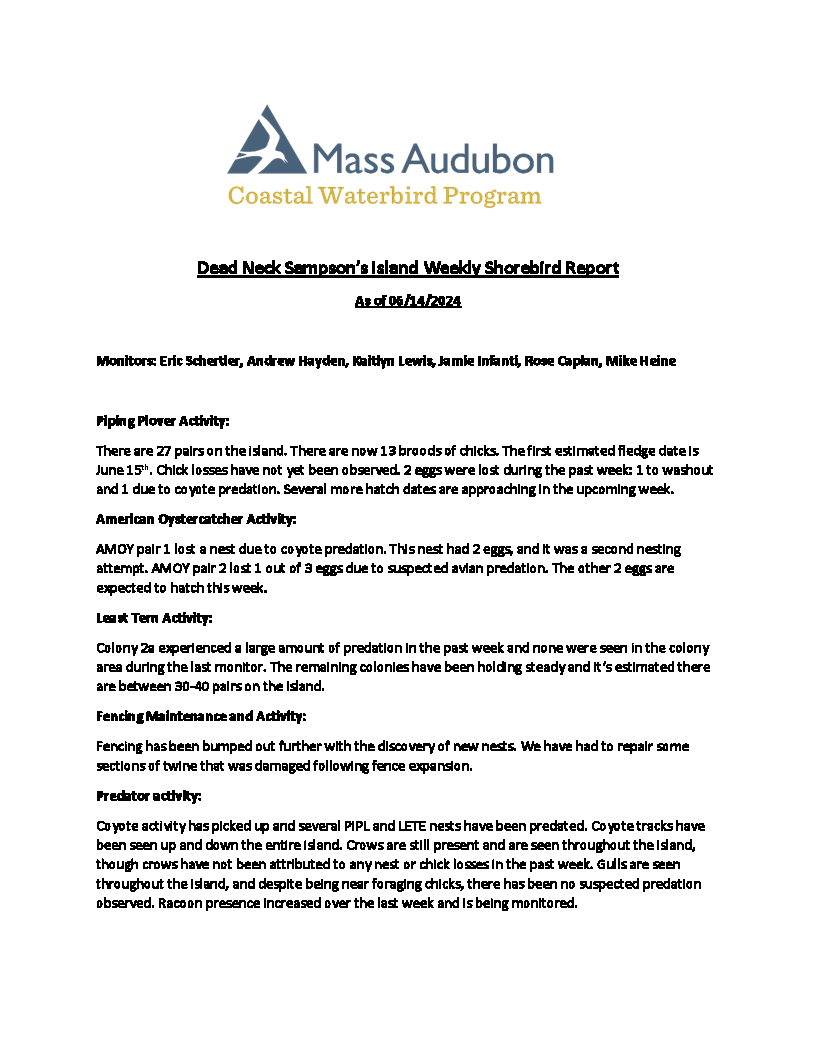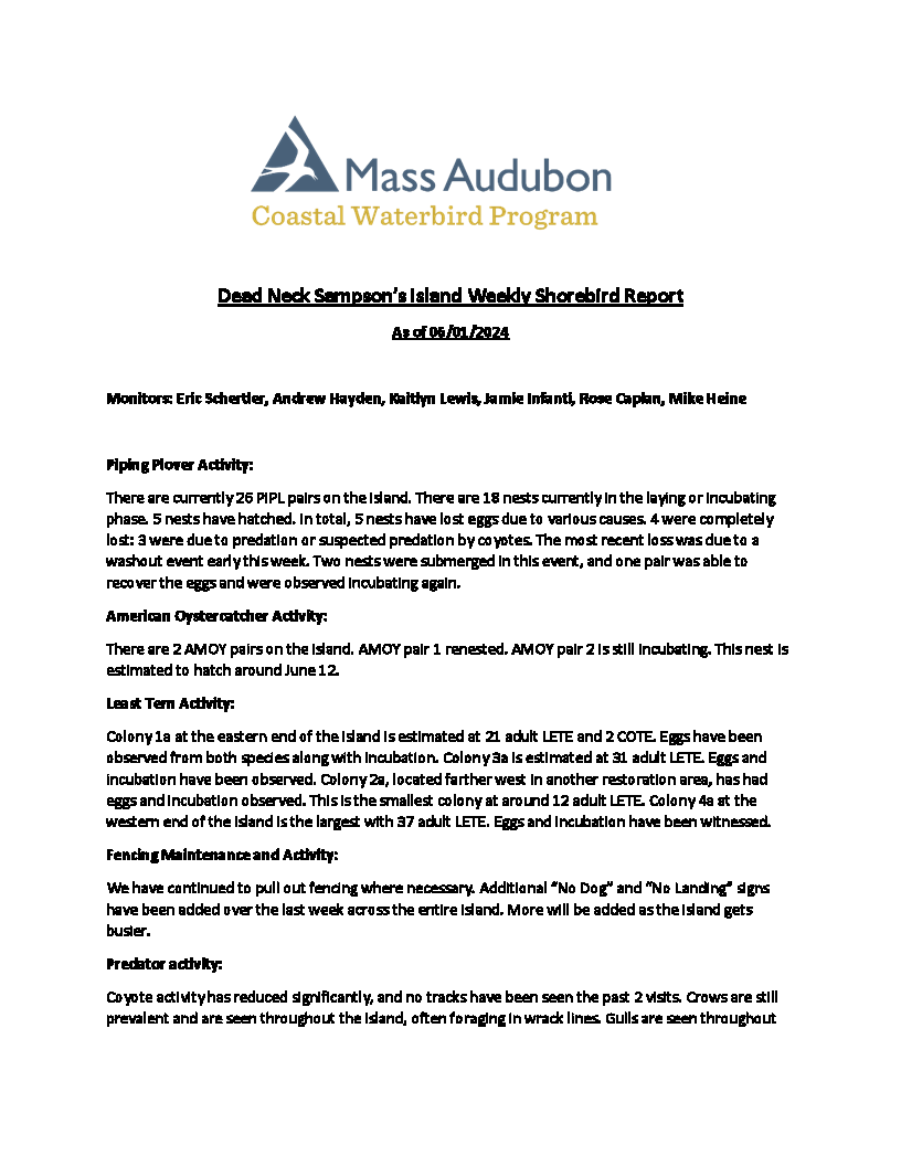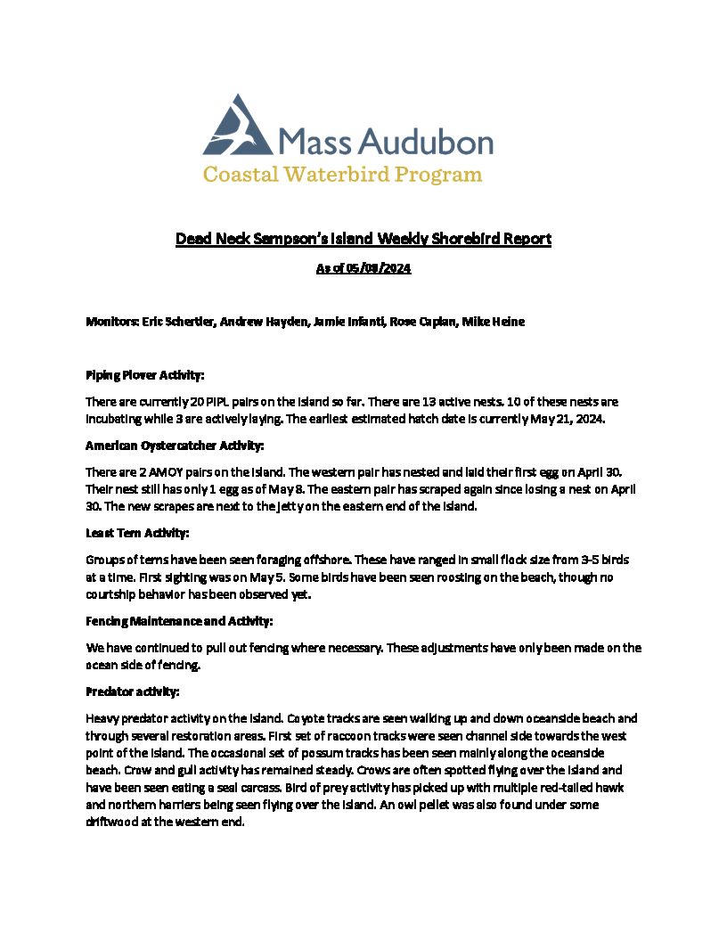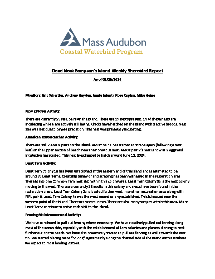 Barnstable Clean Water Coalition (BCWC) monitors wildlife and human activity on Dead Neck Sampson’s Island (DNSI), along with staff from the Coastal Waterbird Program of the Massachusetts Audubon Society (Mass Audubon). These efforts are especially important during the warmer months when the island receives an influx of visitors, where at the same time, locally-threatened Piping Plovers (Charadrius melodus) and Least Terns (Sternula antillarum) are actively nesting. These shallow nests, called scrapings, are extremely fragile and susceptible to frequent predation by other birds, foxes, and coyotes. The scrapings are typically found along the ocean-side of DNSI and are the reason for its seasonal closure. It is important not to disturb the nests and for visitors to stay away from active nesting sites marked with fencing by Mass Audubon. Additionally, to minimize disturbance to nesting sites and birds, dogs are not allowed on the island.