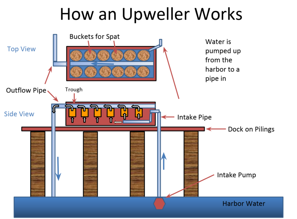 So, how exactly does an upweller work? The tank contains ten buckets that hold the oysters. Water is continuously pumped from Hyannis Harbor into the tank and through the buckets, with the oysters filter feeding on phytoplankton and algae. The cleaner, oyster-filtered water is then pumped back into Hyannis Harbor.