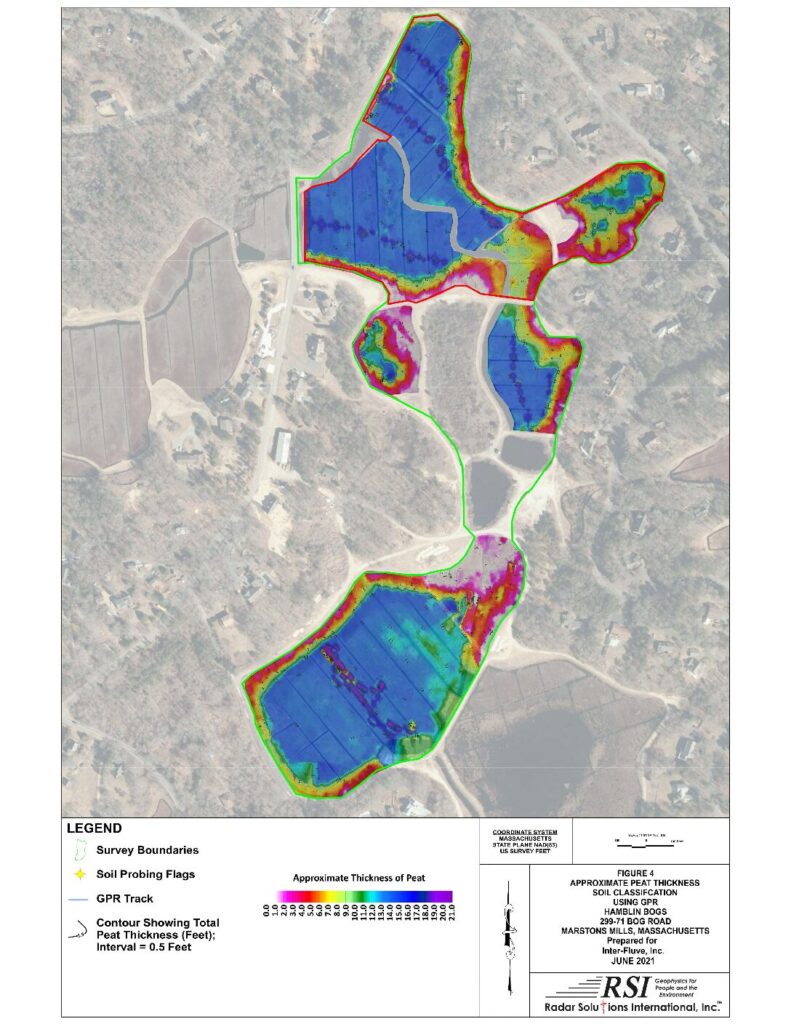 This map shows some of the results of a ground penetrating radar study. The peat (partially decayed wetlands vegetative matter) is over twelve feet thick in most locations along the cranberry bogs. This data helps to confirm that this area was once a thriving wetlands habitat